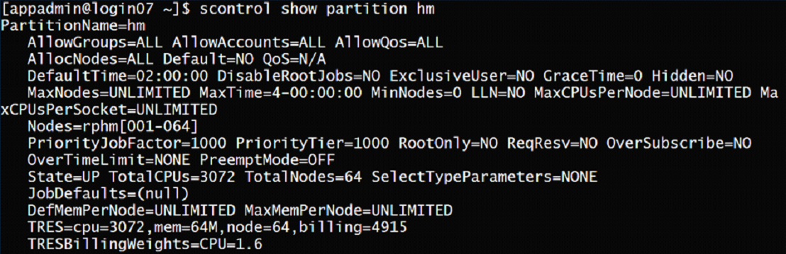 scontrol show partition <partition name>- shows detailed information about a specific partition