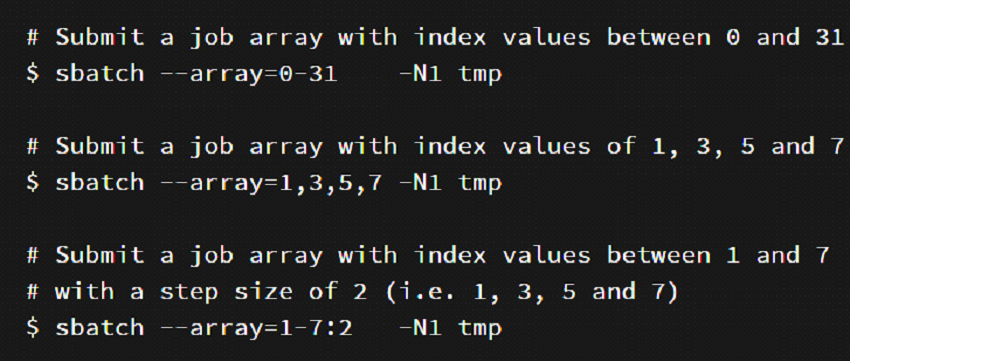 | Job Arrays | -t [array_spec] | --array=[array_spec] OR -a [array_spec] |