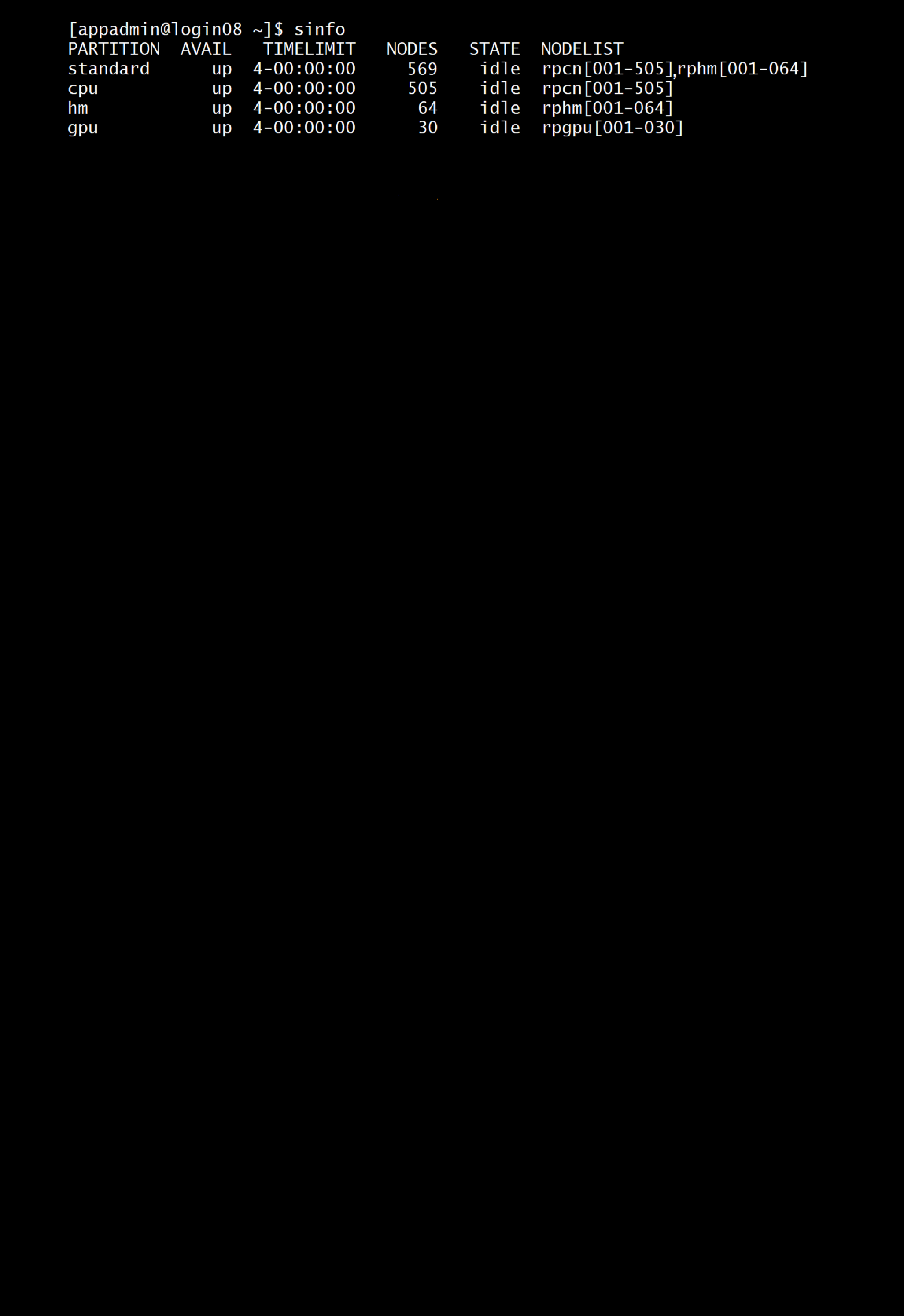 - standard: By default, All user job will be submitted to the standard partition which contains 572 nodes. These nodes consist of CPU and High Memory (HM) nodes.