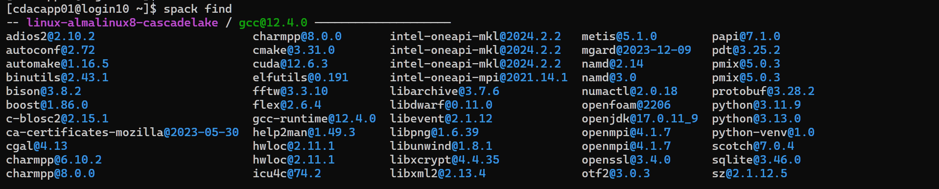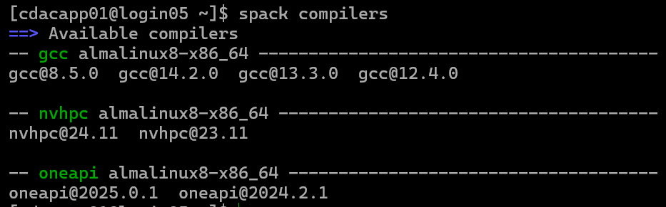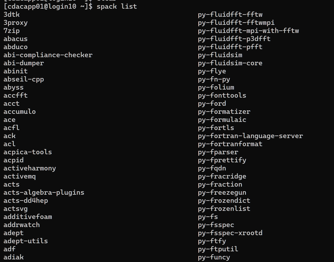 PARAM Rudra extensively uses spack. The purpose of spack is to provide freedom to users for loading required applications or packages of specific versions with all its dependencies in the user environment. Users can find the list of all installed packages with their specific versions and dependencies. This also specifies which version of the application is available for a given session. All applications and libraries are made available through spack. A User has to load the appropriate package from the available packages.