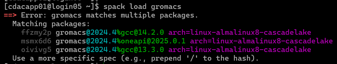 Above command will install gromacs version 2020.5 with blas and cuda support and without MPI support. For blas there are multiple providers like OpenBLAS, Intel MKL, amdblis, and essl, ^intel-mkl will tell spack to use intel-mkl for blas routines.